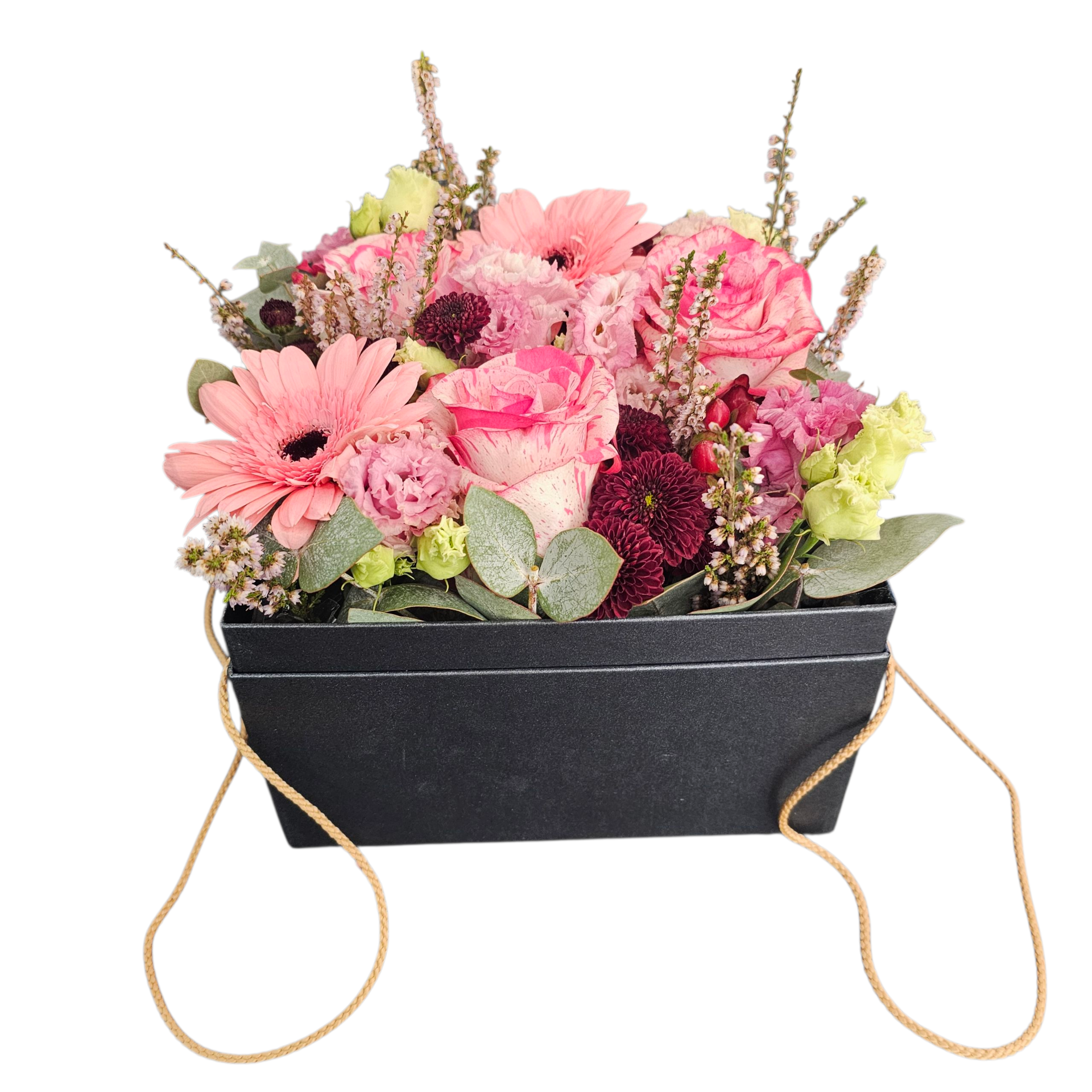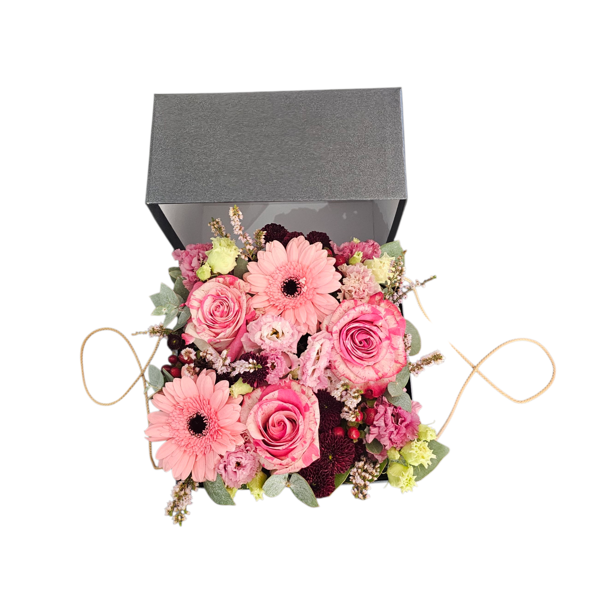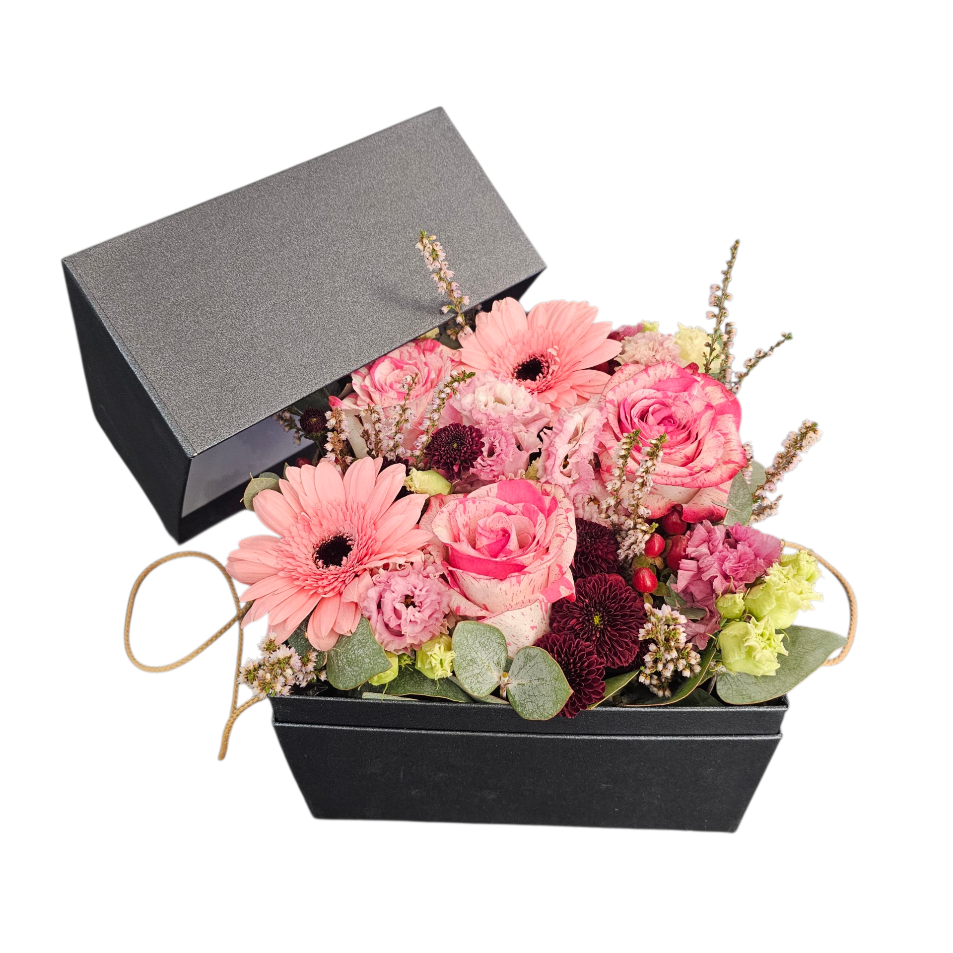verspielte Blumenbox in rosa-bordeaux Tönen.