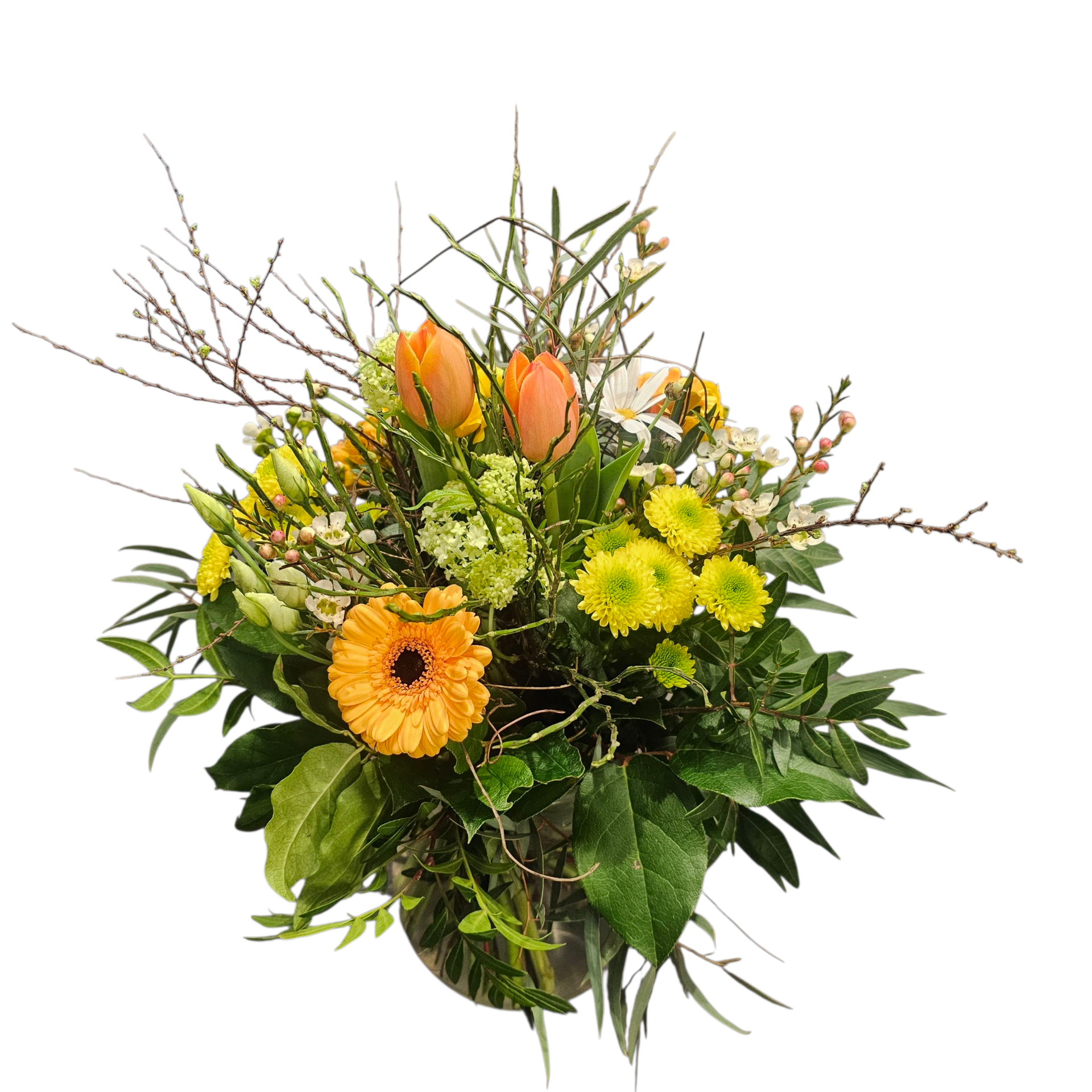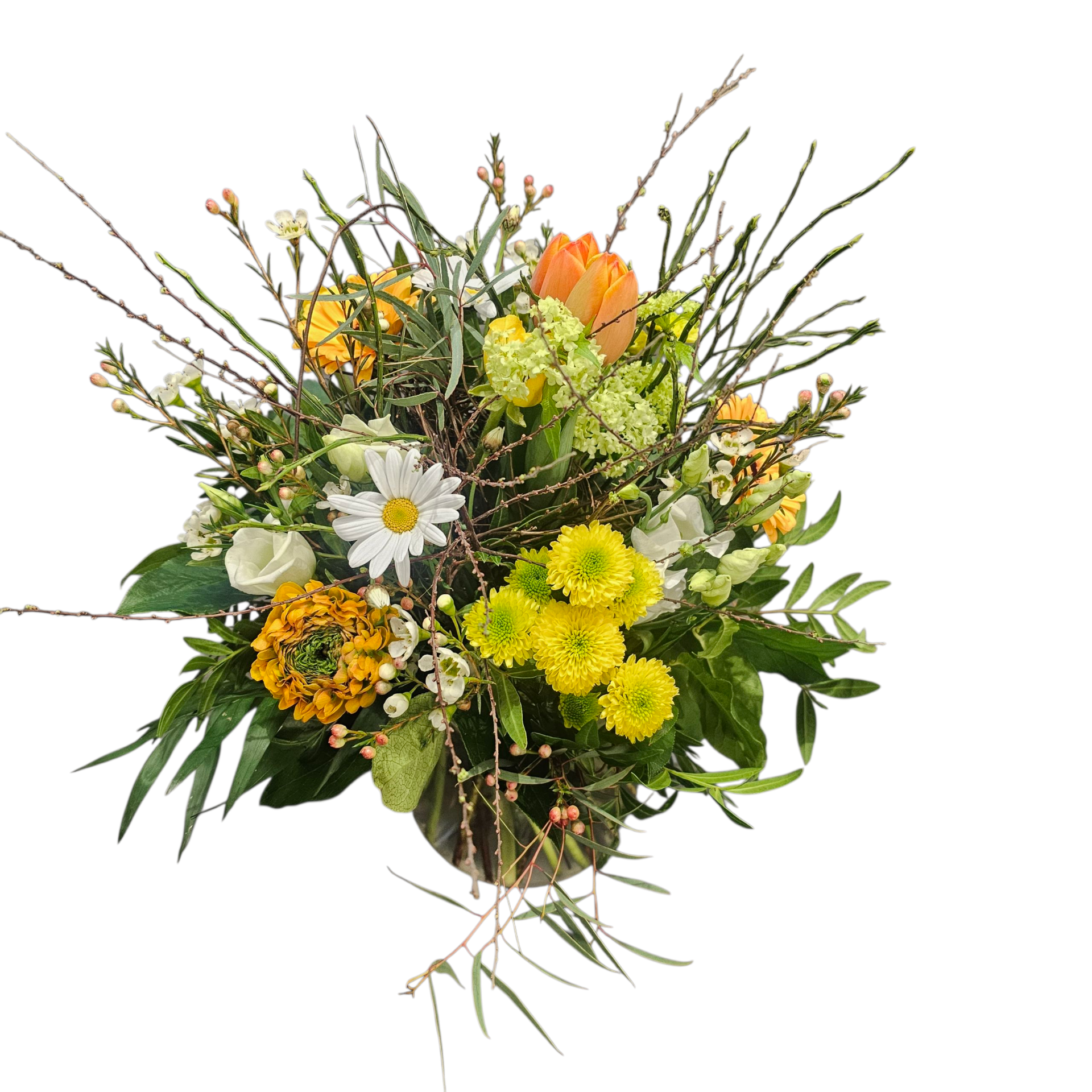 Unser Frühlingsduett vereint locker gebunden Blüten in sonnigem gelb und zartem hellgrün. Dezentes Grün unterstreicht die Natürlichkeit und verleiht dem Strauss Struktur, ohne die Leichtigkeit zu nehmen.