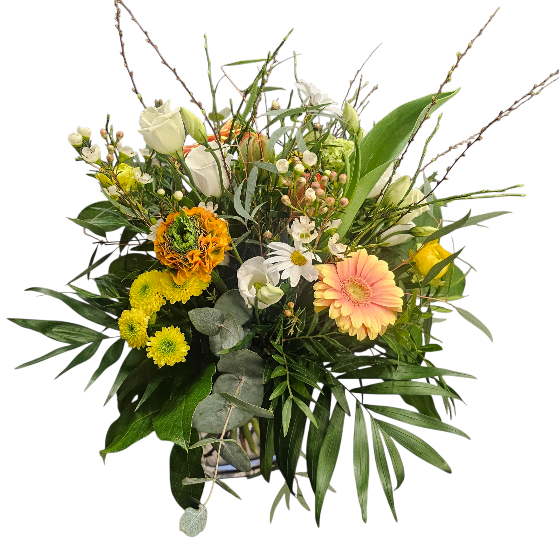 Unser Frühlingslicht vereint ausgewählte Blüten in weiss und sonnigem gelb mit sanften lachsfarbenen Akzenten. Dezentes Grün lockert den Strauss auf und unterstreicht die natürliche Ausstrahlung des Strausses, ohne die Blüten zu dominieren.