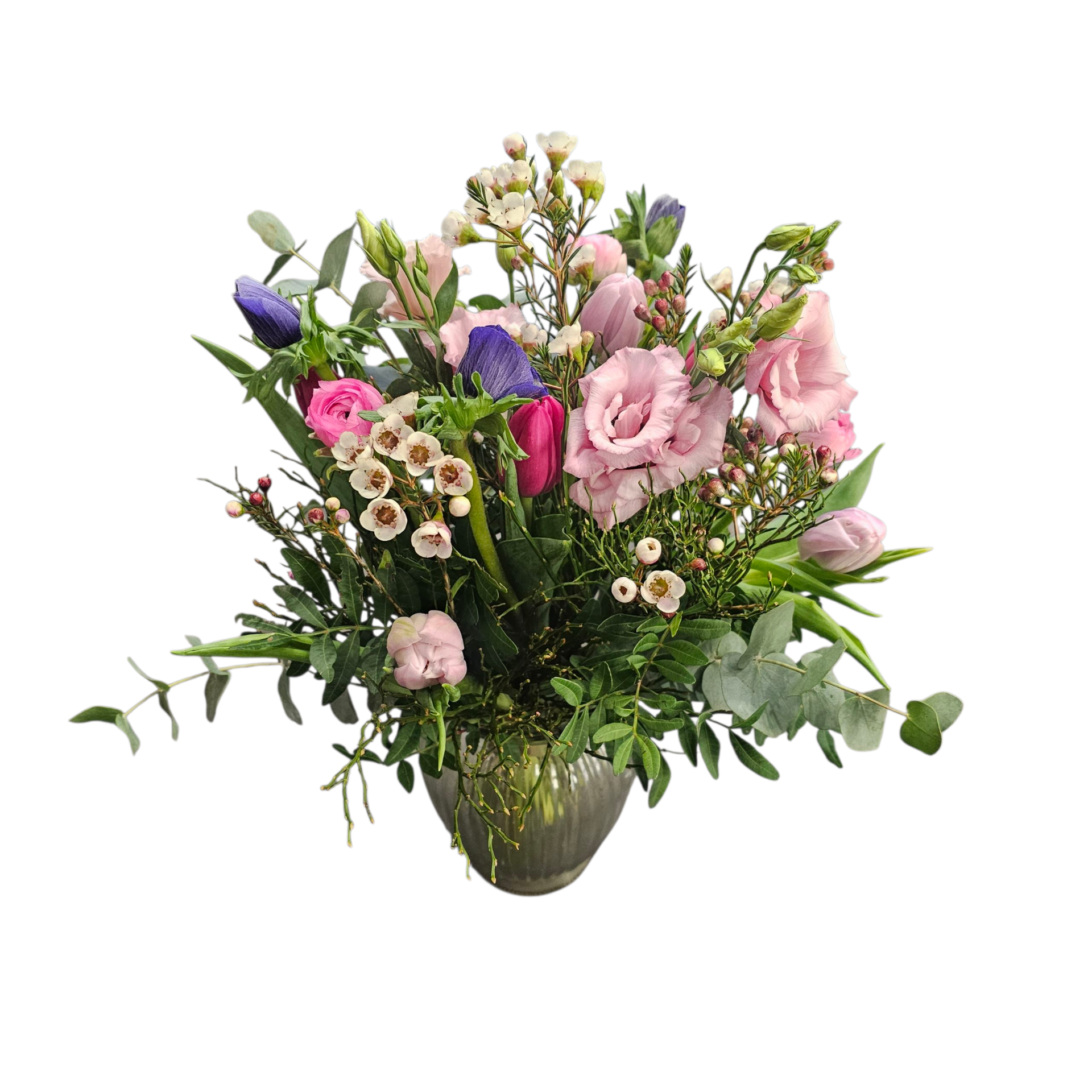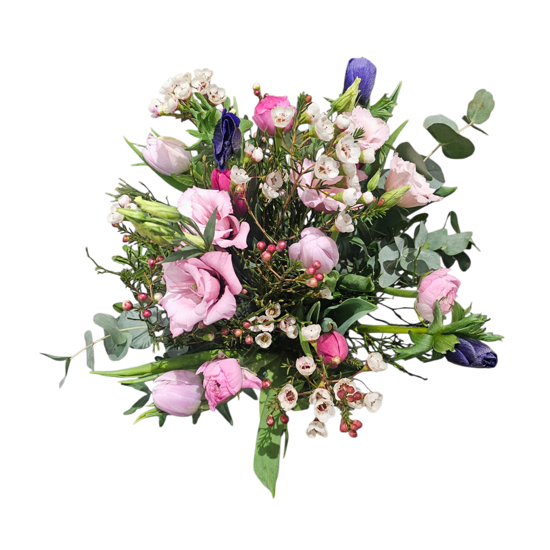 Unser Tulpenstrauss " Frühlingspoesie" vereint zarte Tulpen in Rosa, sanftem blau und feinem weiss mit frischem Heidelbeergrün und edlem Eukalyptus. Die harmonische Farbkomposition wirkt modern, verspielt und zugleich elegant.