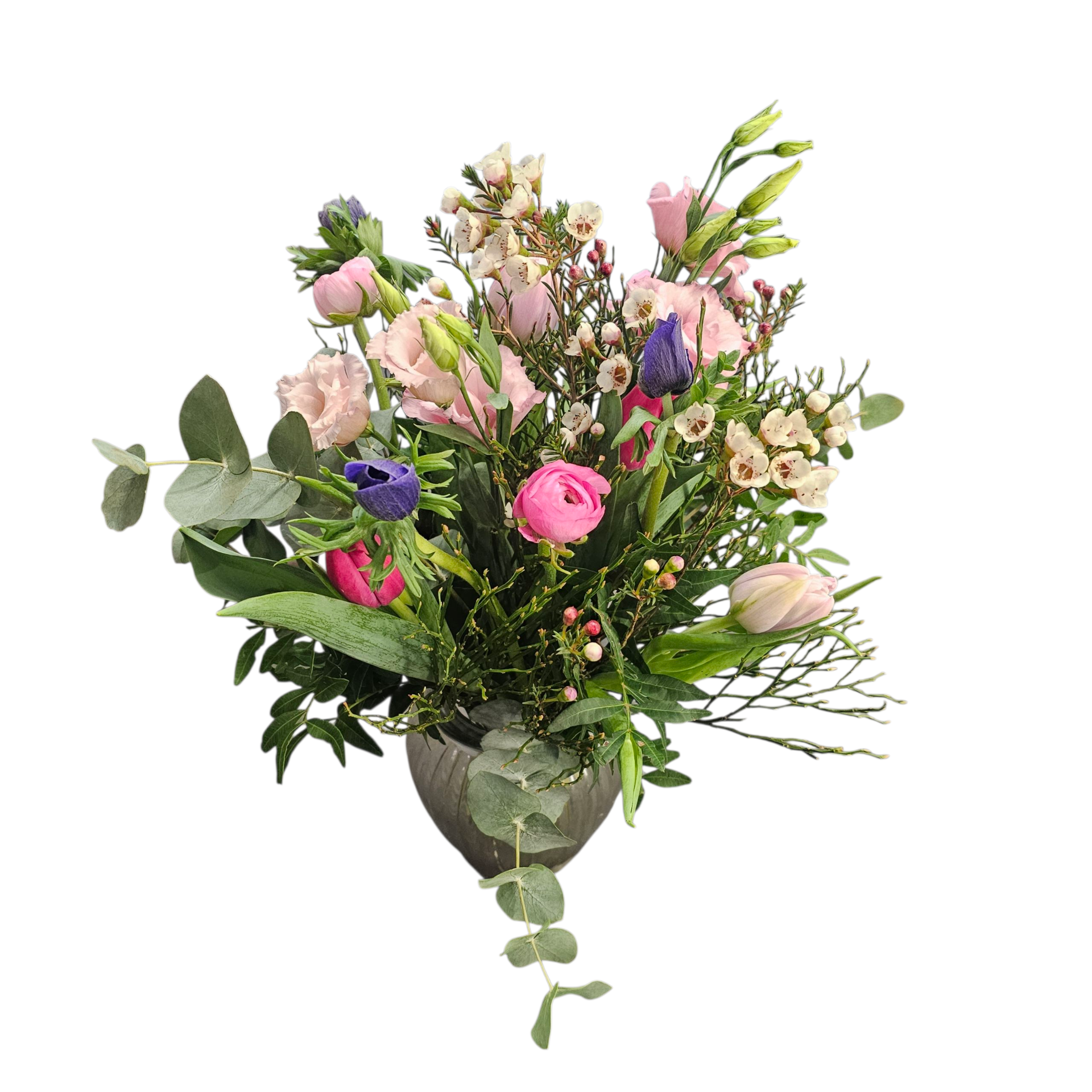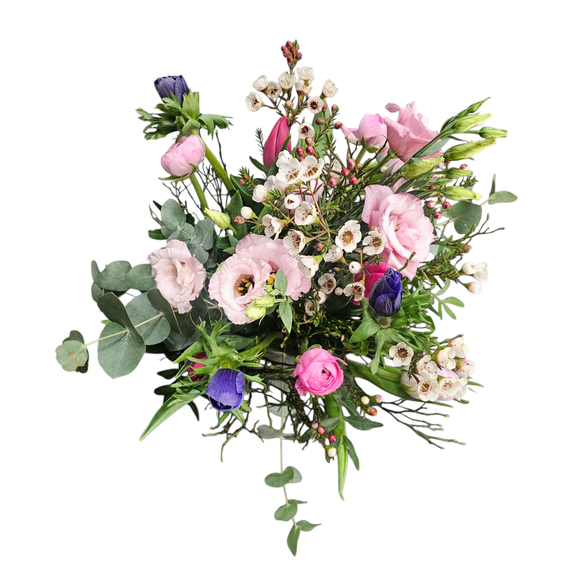Die Unterschiedlichen Nuancen verschmelzen zu einem lebendigen aber dennoch ruhigen Gesamtbild. Das natürliche Grün von Heidelbeerzweigen und Eukalyptus verleiht dem Strauss Tiefe, Struktur und eine frische, leichte Ausstrahlung.