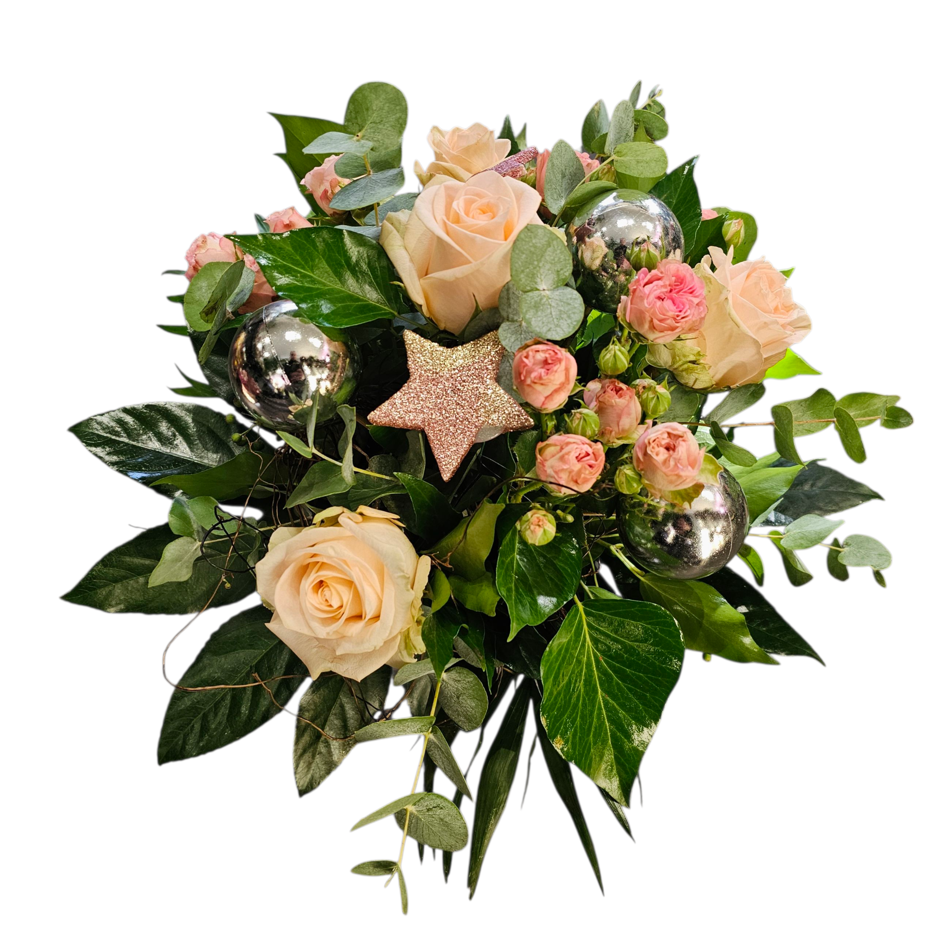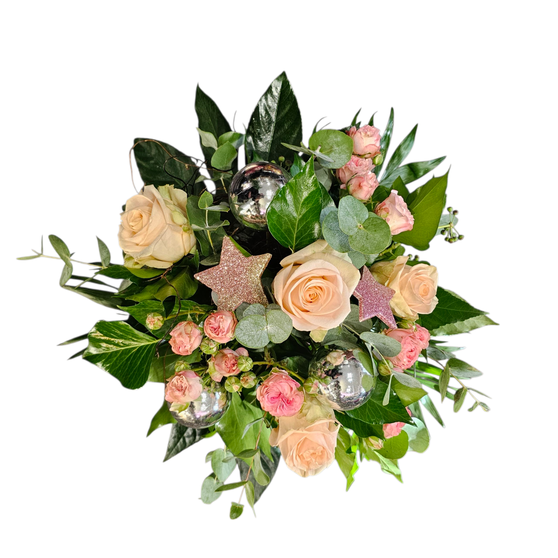 Rosenstrauss mit grossen und kleinen Rosen gebunden. Dekoriert mit Kugeln und Sternen