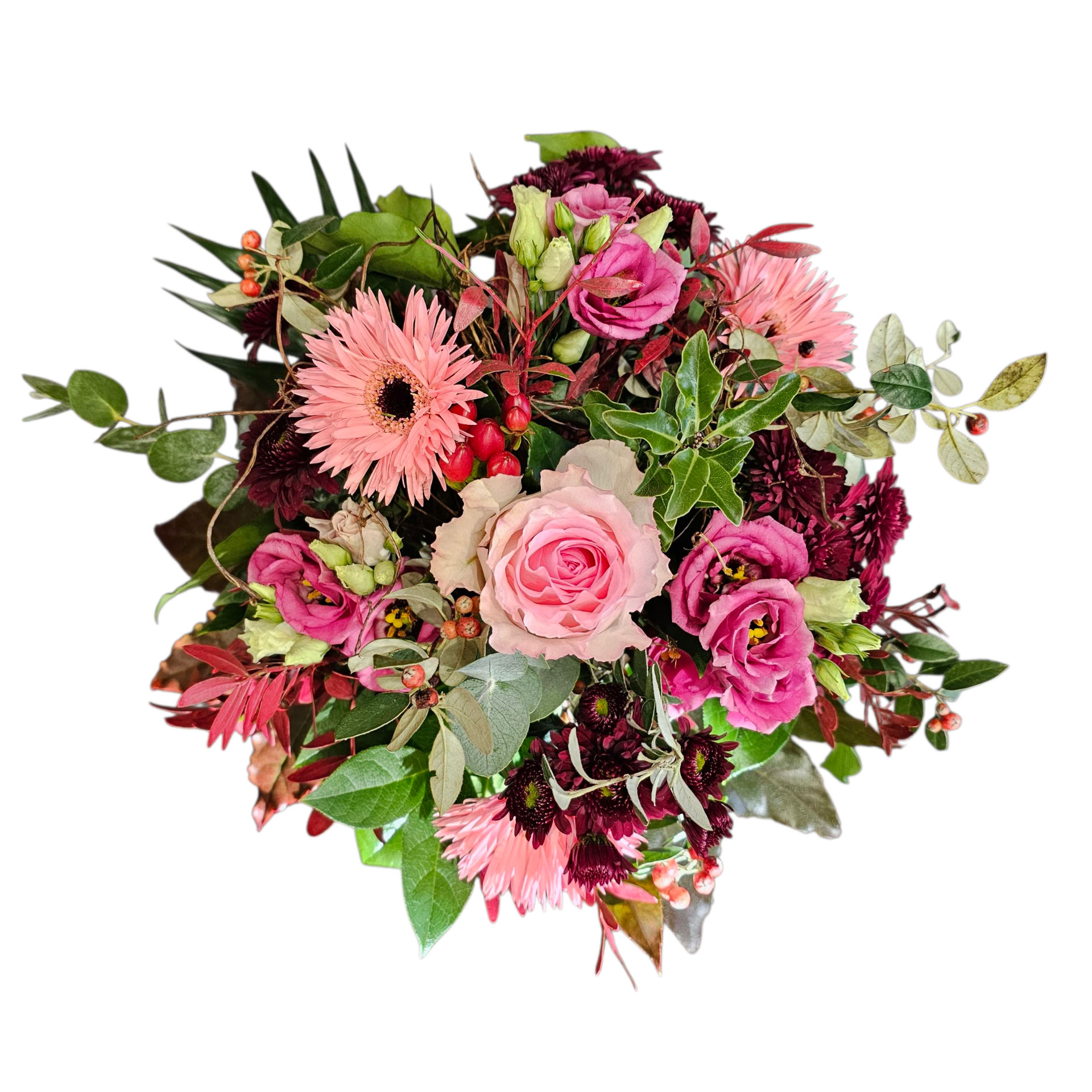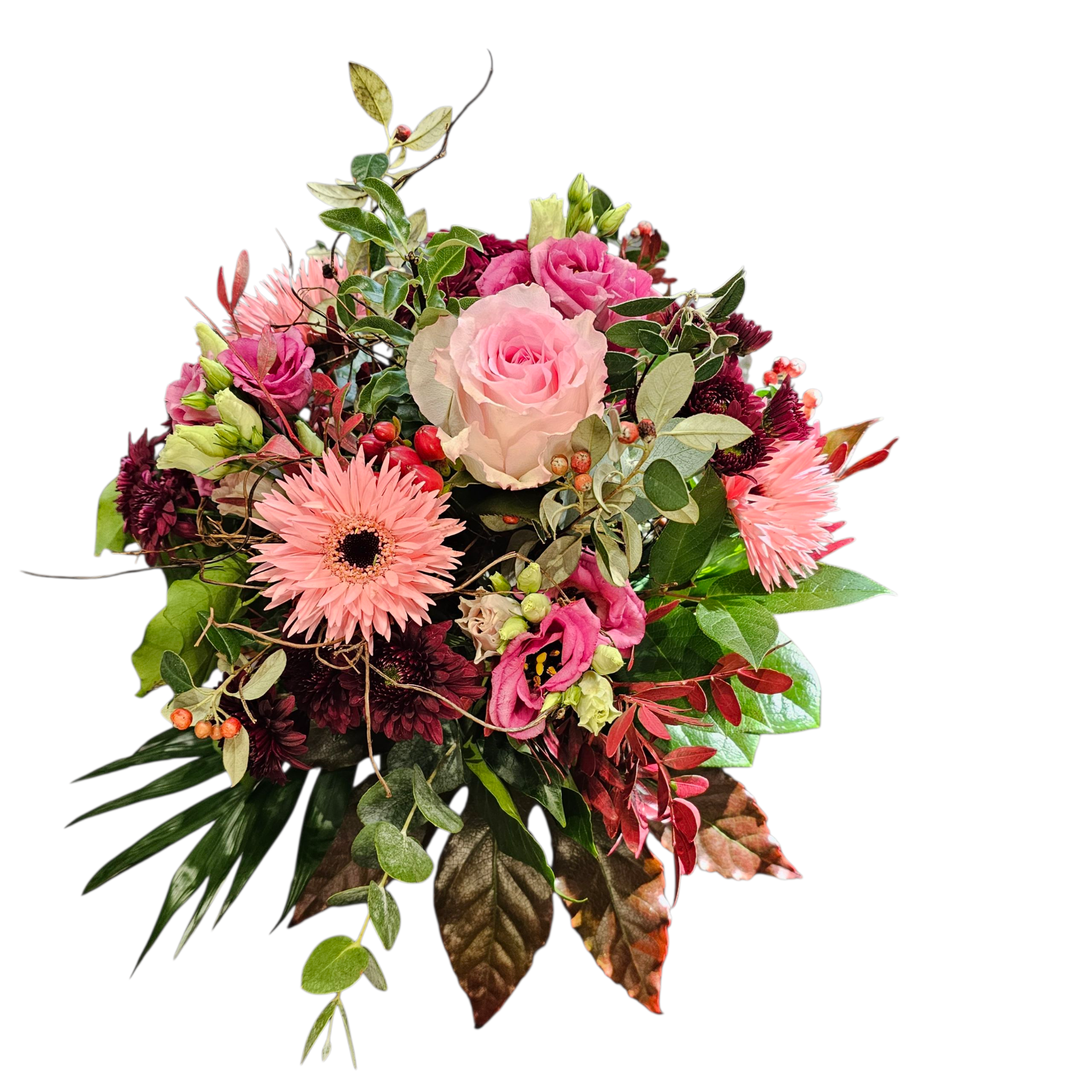 ein verspielter, romantischer Blumenstrauss in verschiedenen rosa und bordeaux Tönen.