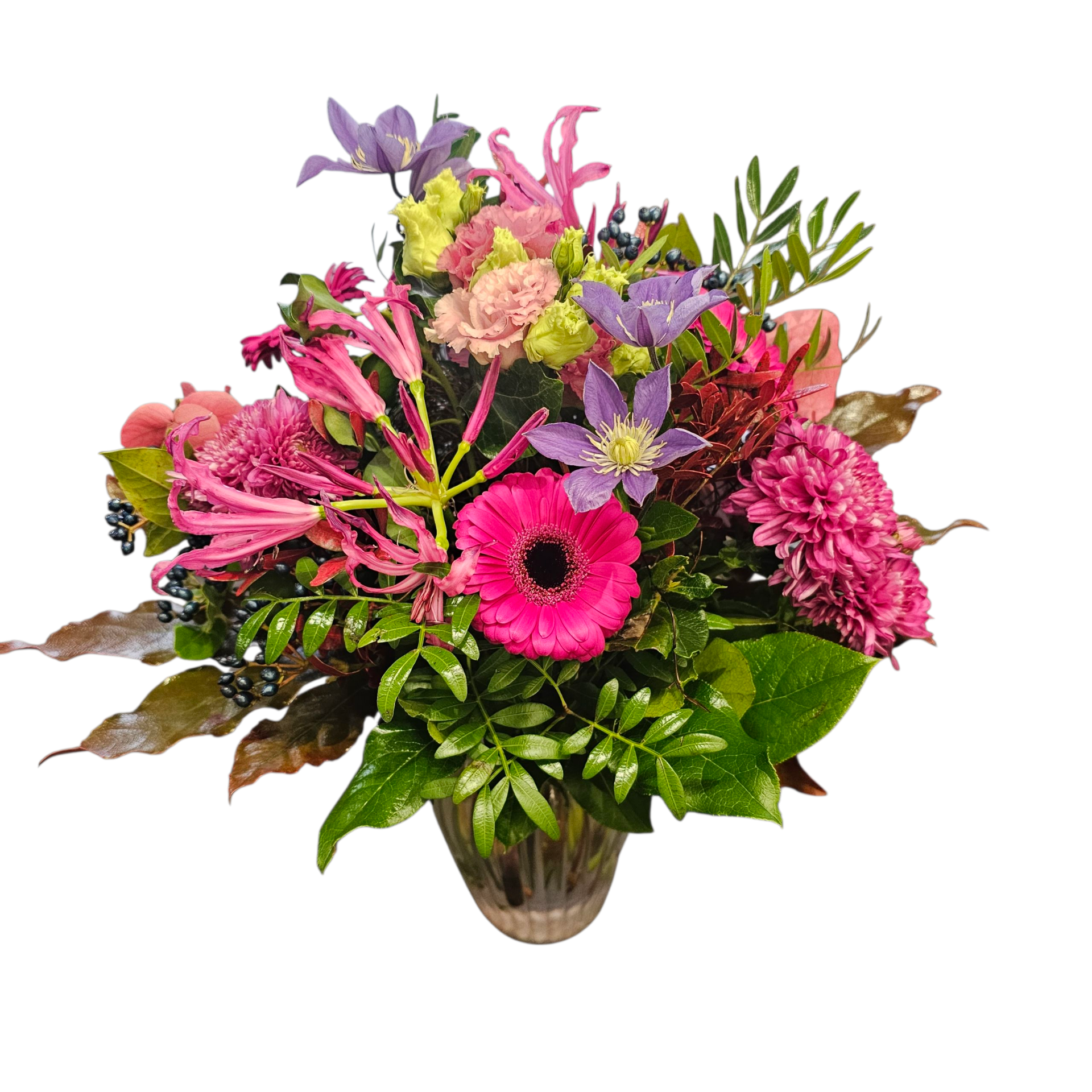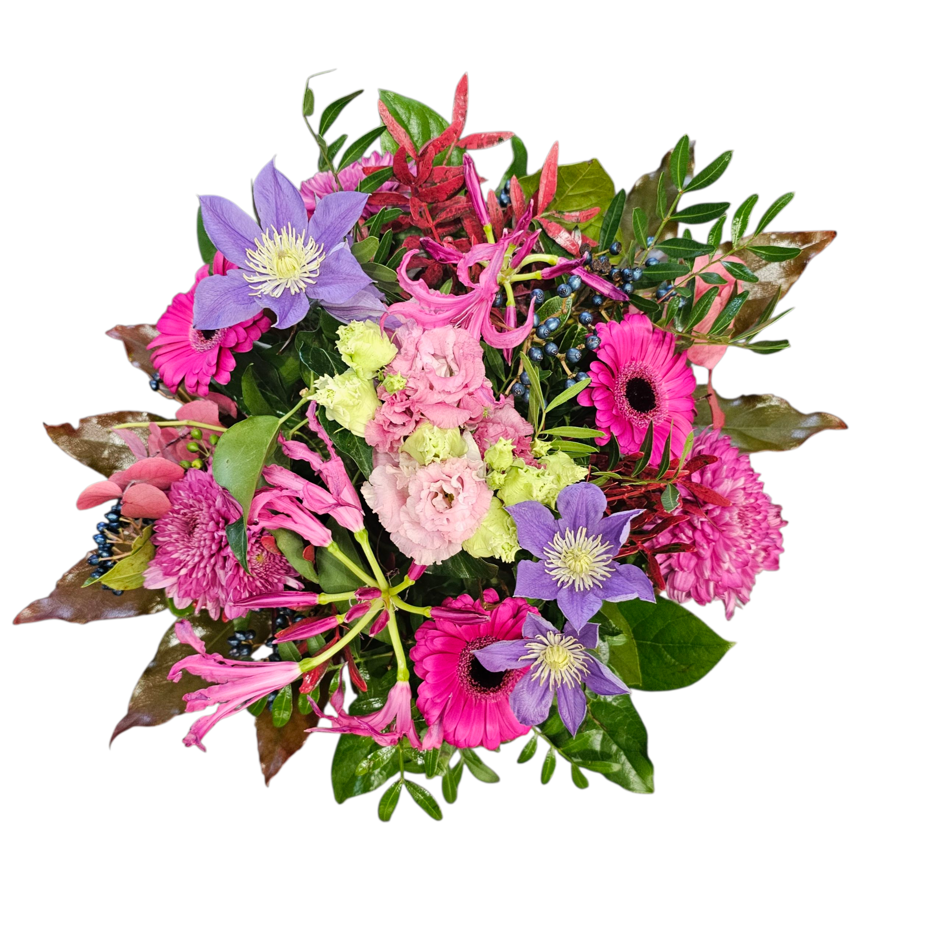 Blumenstrauss in kräftigen pink Tönen und Beeren. Leicht verspielt mit lila Blüten.