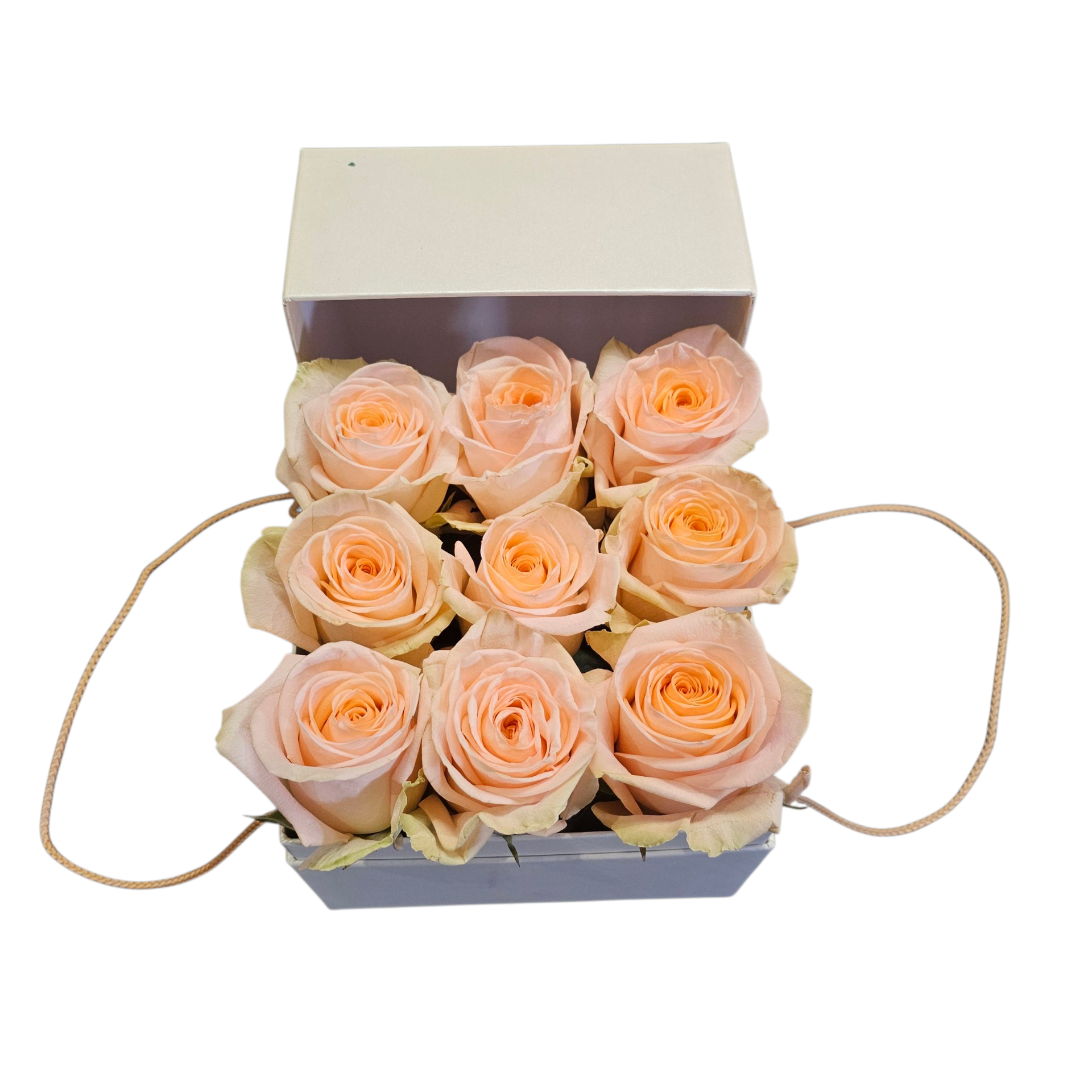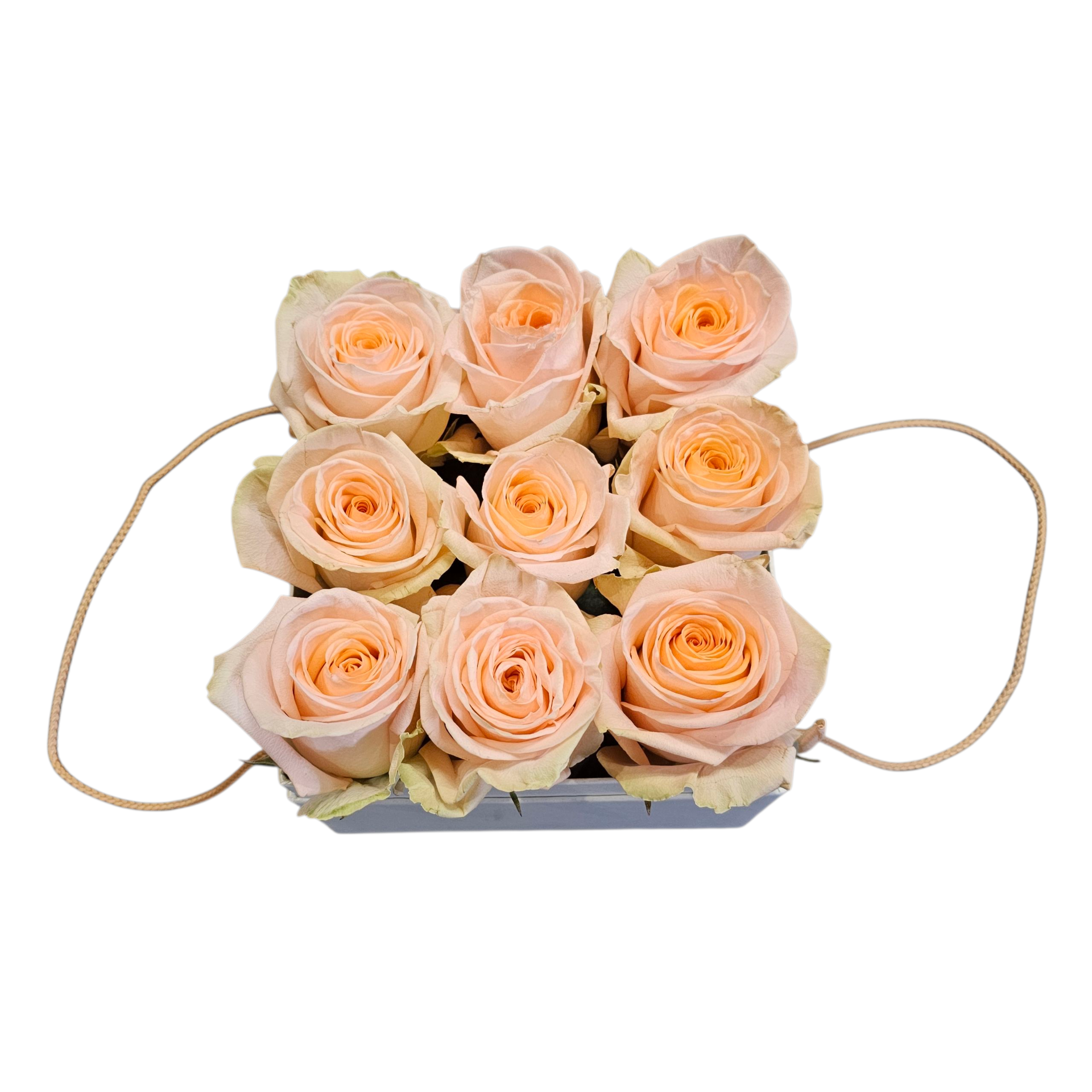 Die Rosenbox (15x15cm) ist mit 9 lachsfarbigen Rosen von Hand arrangiert.